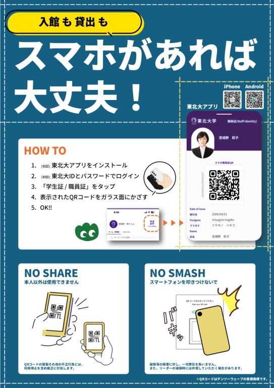 北青葉山分館で、東北大アプリのQRコード(デジタル学生証・職員証)を使って、入退館ができるようになりました。