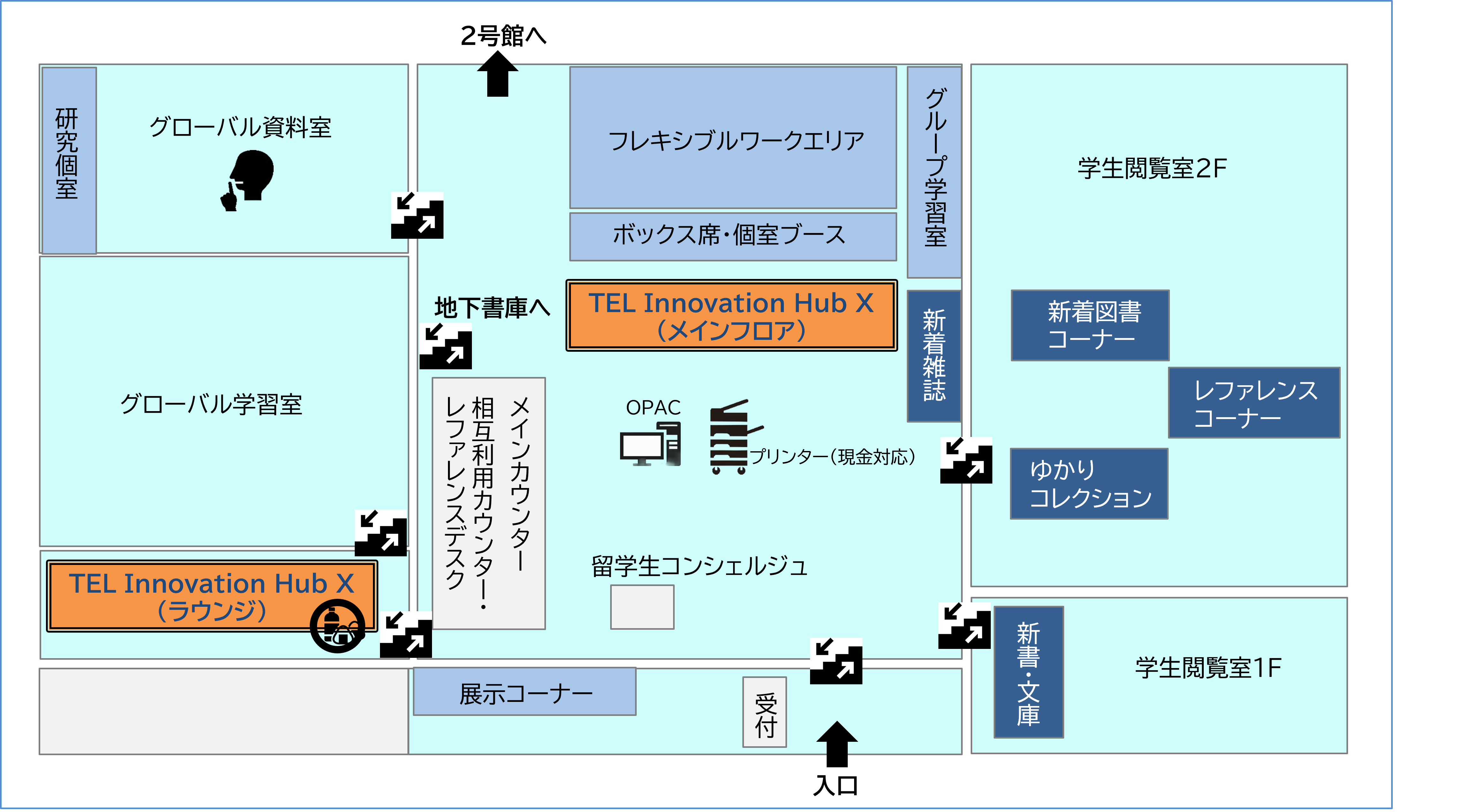 - 1階:受付カウンター、メインカウンター、相互利用カウンター/レファレンスデスク、留学生コンシェルジュ、グループ学習室、学生閲覧室