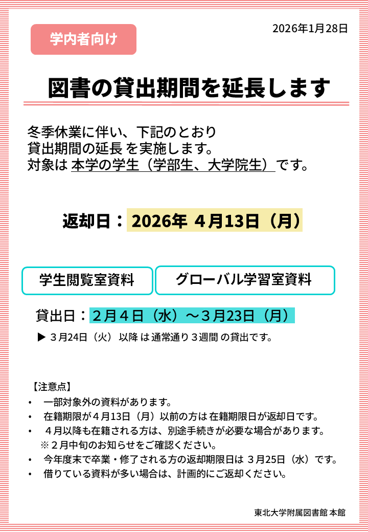 【本館】春季休業に伴う貸出期間延長について(本学学生向け)