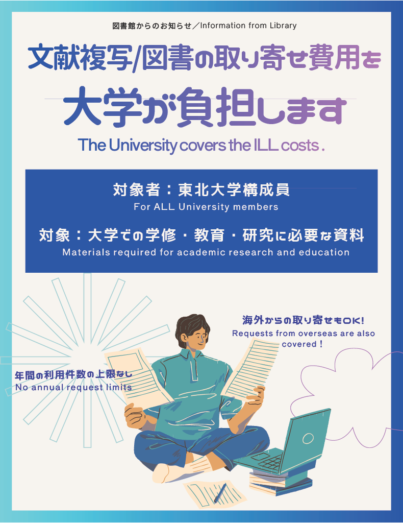 【全館】ILL費用は大学負担でご利用いただけます/【All Libraries】 The university cover the cost of ILL requests.